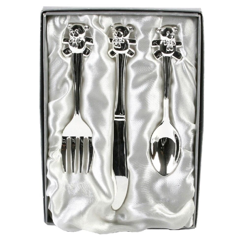 Oszałamiający posrebrzany zestaw sztućców z serii Celebration. Ten piękny zestaw sztućców posrebrzanych składa się z noża, widelca i łyżeczki. Każdy element tego pięknego posrebrzanego zestawu (łyżeczka, nóż i widelec) ma wspaniały grawerowany wzór uroczego tłoczonego misia.