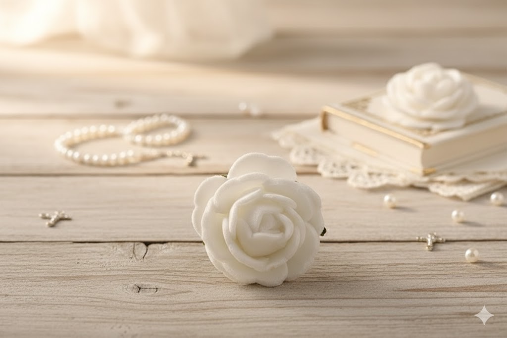 Ta przypinka komunijna do włosów to subtelna i bardzo naturalnie prezentująca się ozdoba, inspirowana klasycznym kształtem róży. Kwiat w czystej bieli został wykonany z lekkiego, miękkiego materiału piankowego, który doskonale imituje delikatne płatki kwiatów, zachowując przy tym spokojny i elegancki charakter stylizacji komunijnej.