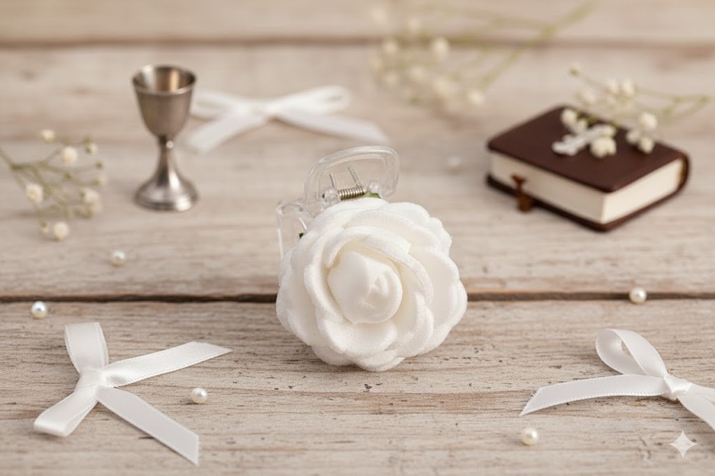 Warstwowo ułożone płatki tworzą harmonijną, pełną rozetę o matowym wykończeniu. Dzięki temu przypinka wygląda niezwykle naturalnie i nie odbija światła, co sprawia, że idealnie komponuje się z jasnymi sukienkami komunijnymi oraz klasycznymi fryzurami. Ozdoba osadzona jest na przezroczystym klipsie, który zapewnia stabilne i wygodne mocowanie, pozostając niemal niewidoczny we włosach.