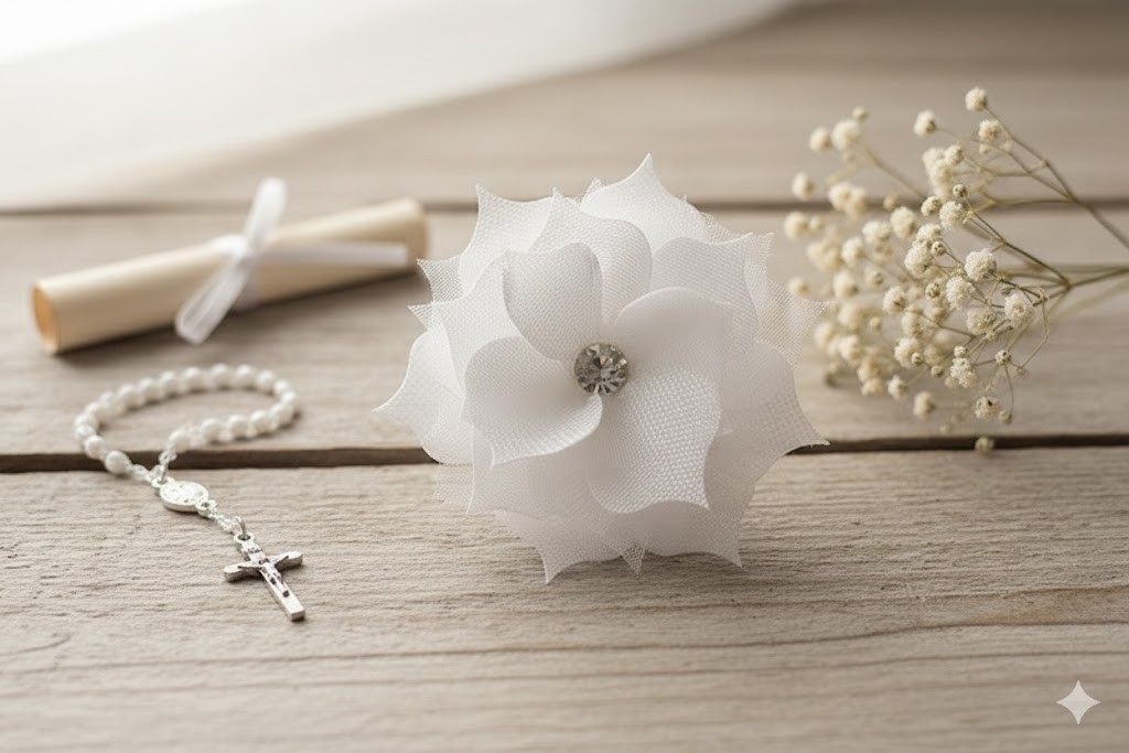 Ta przypinka komunijna do włosów to elegancka i efektowna ozdoba, która łączy lekkość tiulu z subtelnym, biżuteryjnym akcentem. Przestrzenny kwiat w czystej bieli przyciąga wzrok delikatną formą i starannym wykończeniem, idealnie wpisując się w uroczysty charakter Pierwszej Komunii Świętej.