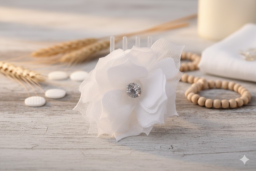 Przypinka komunijna do włosów – tiulowy kwiat z subtelnym kryształkiem
