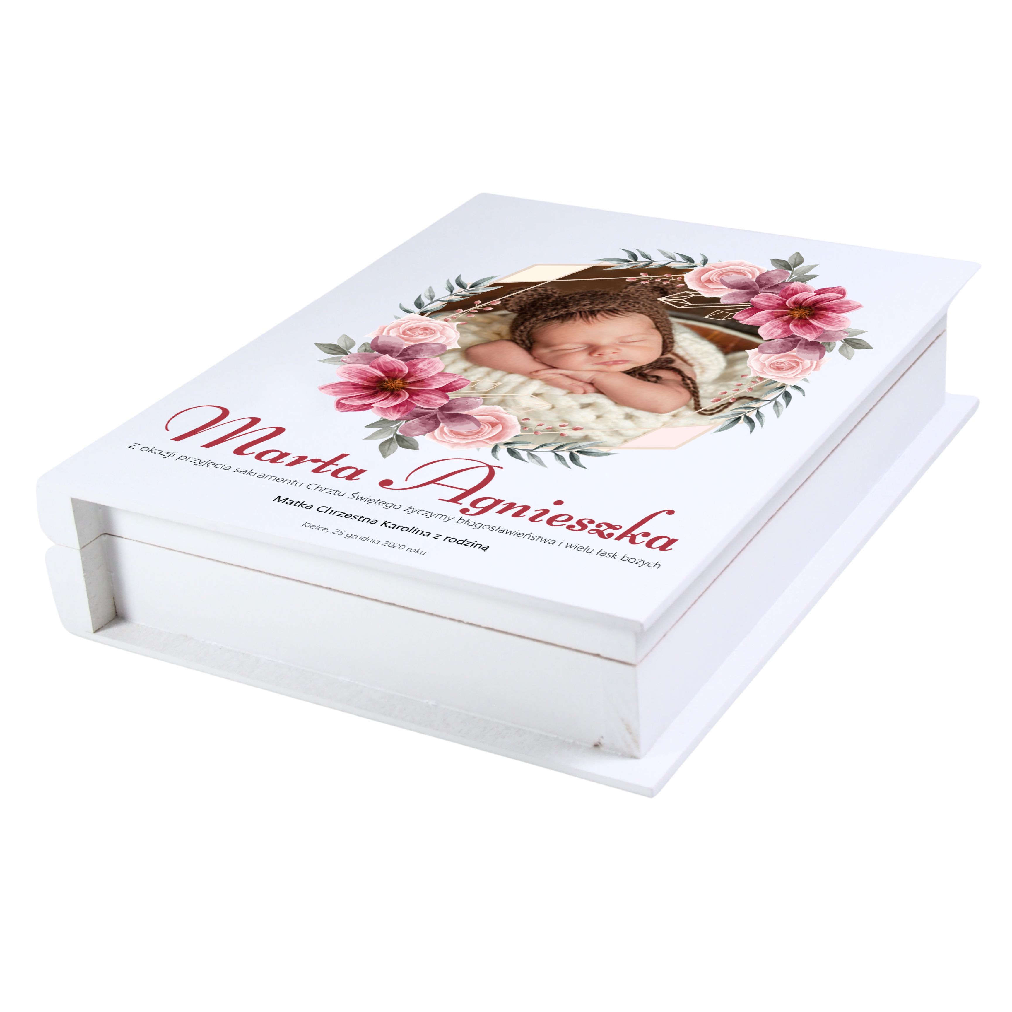 Wyjątkowe pudełko pamiątkowe z nadrukiem to piękna i trwała oprawa dla wspomnień z Chrztu Świętego. Drewniana skrzyneczka pomieści najcenniejsze pamiątki maleństwa – Biblię, szatkę, zdjęcie USG, pierwszy kosmyk włosów, opaskę ze szpitala czy płytę z uroczystości.
