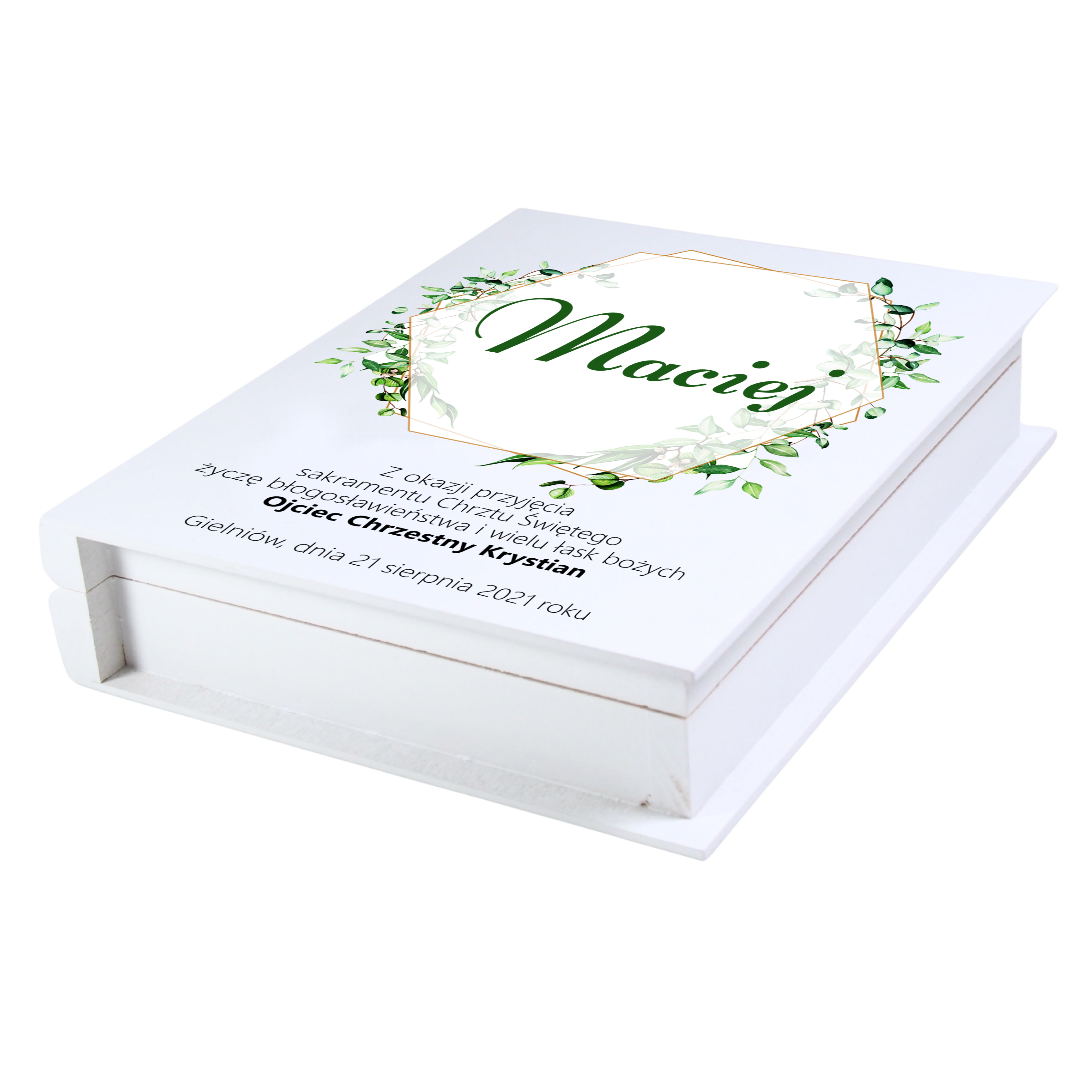 Pamiątkowe pudełko drewniane z nadrukiem „EUKALIPTUS” – skrzyneczka na Chrzest Święty