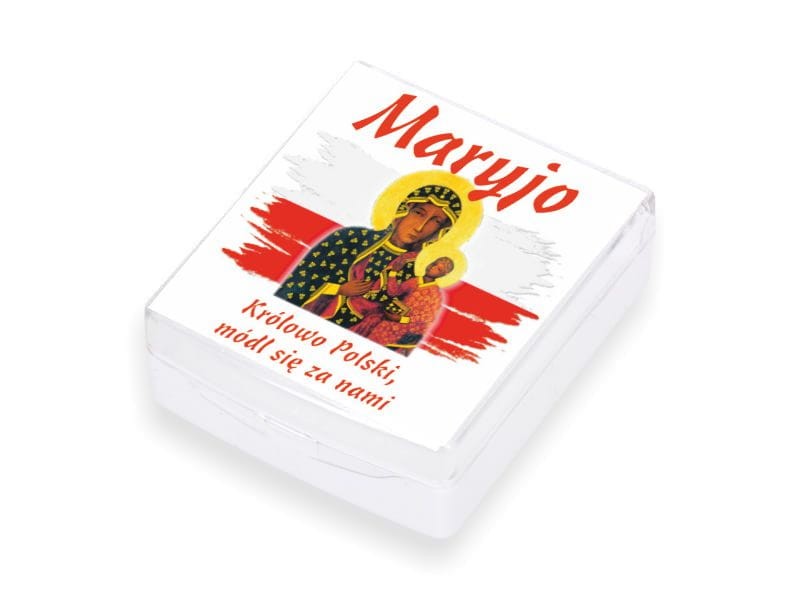 Symboliczny nadruk UV na wieczku podkreśla wyjątkowy charakter przedmiotu i przypomina o opiece Matki Bożej nad Polską i wszystkimi, którzy zwracają się do Niej z modlitwą.