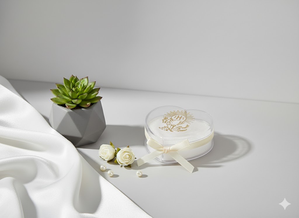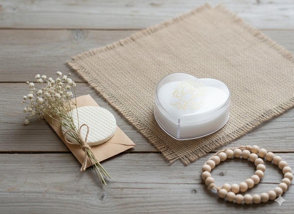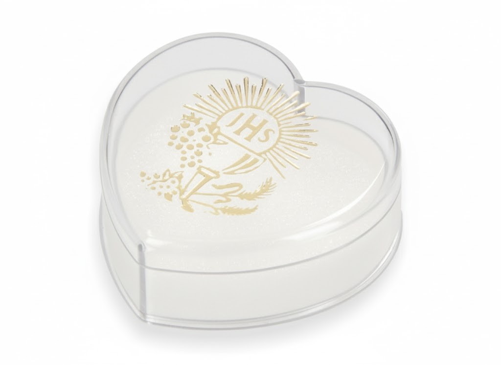 Eleganckie pudełko w kształcie serca z nadrukiem symbolu IHS oraz motywem kielicha to doskonałe opakowanie na różaniec — zarówno jako elegancki prezent, jak i praktyczne etui do jego przechowania. Wykonane z odpornego plastiku, o wymiarach około 5 × 5 cm, idealnie mieszczące różaniec.