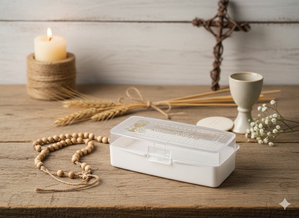 Pudełko przeznaczone do przechowywania różańca, wykonane z lekkiego i trwałego tworzywa sztucznego. Otwierana konstrukcja umożliwia wygodne użytkowanie oraz zabezpiecza zawartość przed zabrudzeniem i uszkodzeniem.