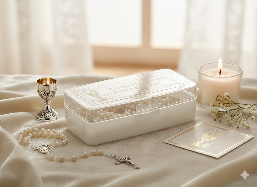 Na wieczku umieszczony został dekoracyjny napis „Pamiątka Pierwszej Komunii Świętej” wraz z delikatnym motywem eucharystycznym, nawiązującym do charakteru uroczystości. Uniwersalna forma sprawia, że pudełko sprawdzi się jako element komunijnego kompletu lub samodzielna pamiątka.