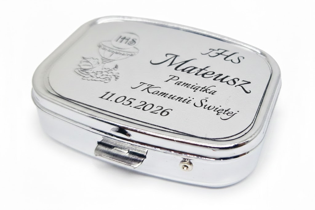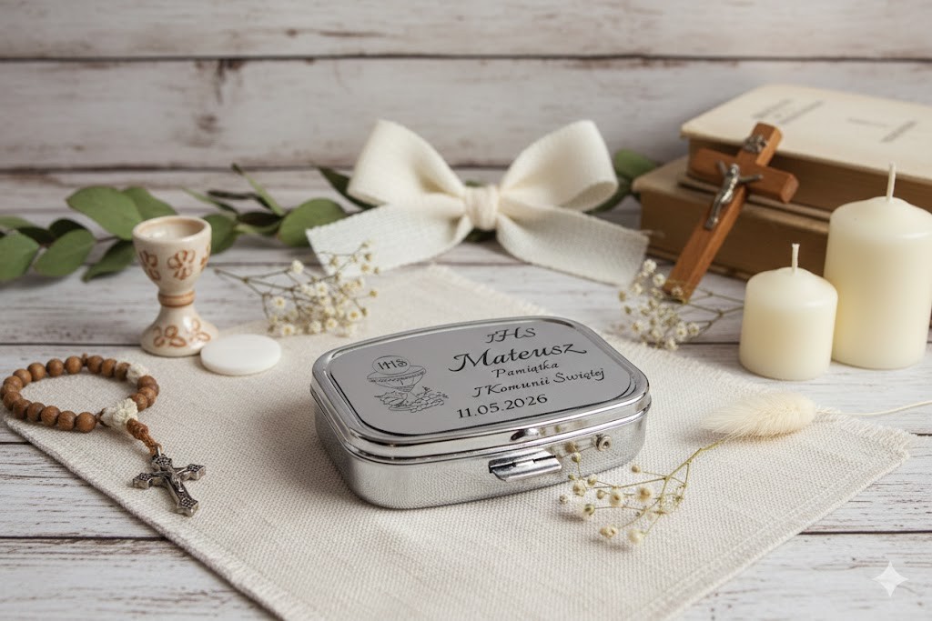 Wykonane z trwałego, wysokiej jakości tworzywa w kolorze metalicznego srebra, charakteryzuje się prostą, elegancką formą oraz subtelnym połyskiem. Na wieku umieszczony jest grawer eucharystycznego symbolu IHS, który podkreśla sakramentalny charakter uroczystości. Dodatkowo na pudełeczku wykonywany jest grawer z imieniem dziecka oraz datą Pierwszej Komunii Świętej, dzięki czemu każdy egzemplarz ma indywidualny, pamiątkowy charakter.