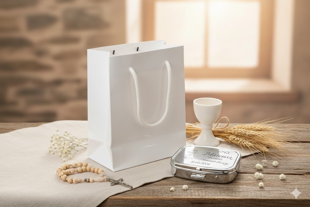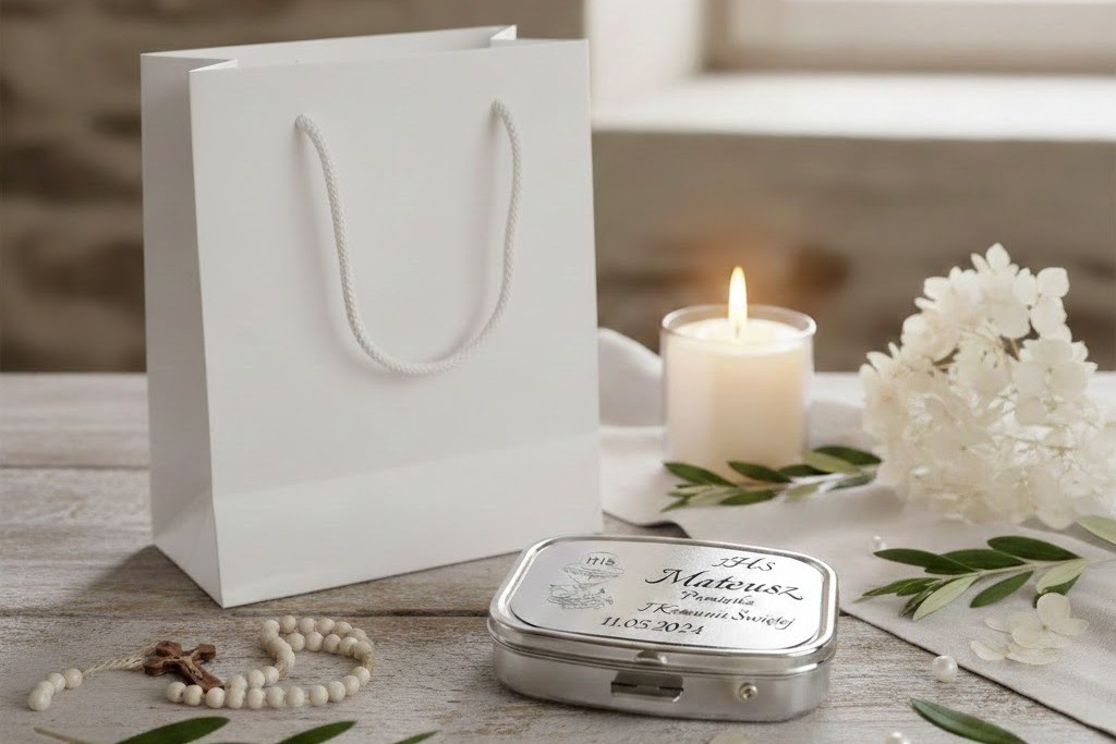 Pudełeczko na różaniec z grawerem IHS stanowi połączenie funkcjonalności z duchowym znaczeniem Pierwszej Komunii Świętej. Przeznaczone jest do bezpiecznego przechowywania różańca – jednego z najważniejszych przedmiotów religijnych towarzyszących dziecku w życiu modlitewnym.