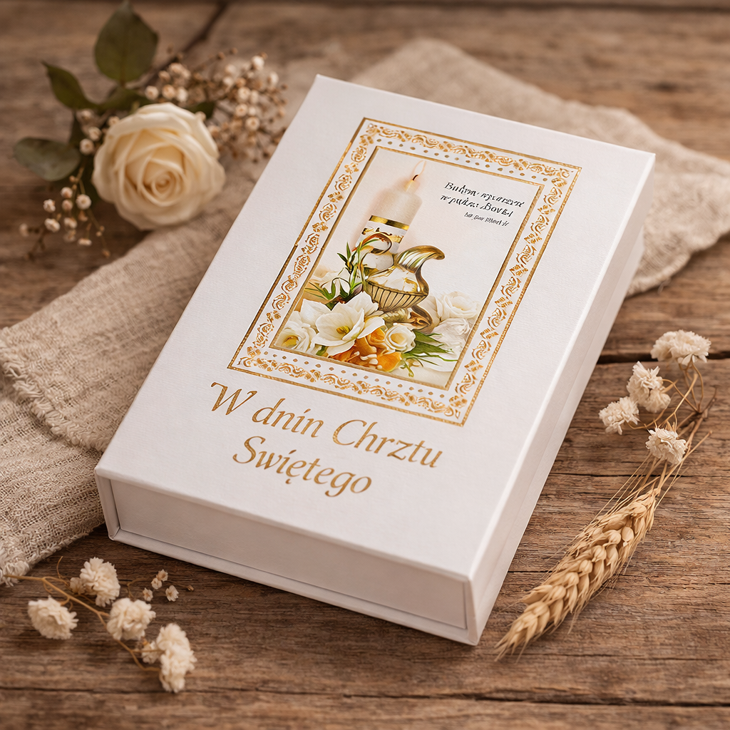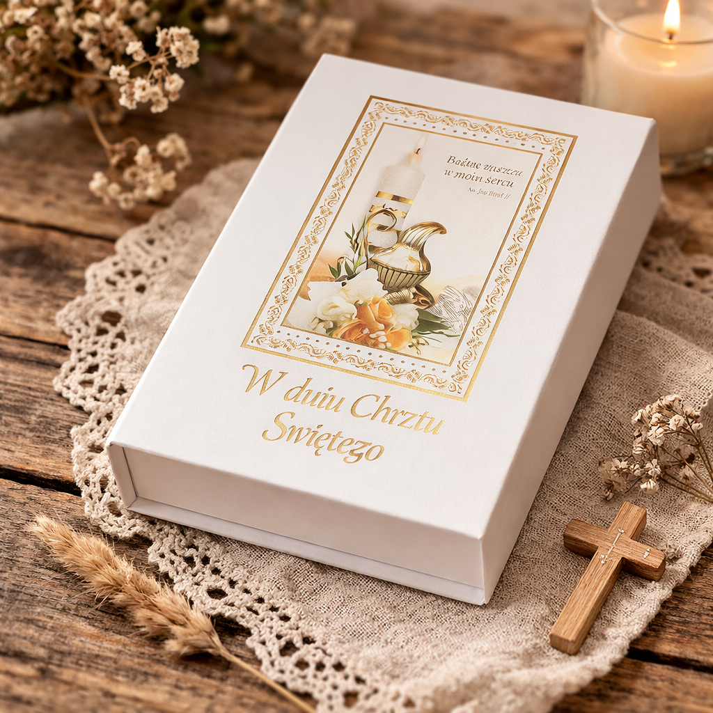 Do zestawu dołączona jest pamiątkowa karta zawierająca metryczkę Chrztu Świętego. Znajduje się na niej miejsce na wpisanie najważniejszych informacji związanych z uroczystością, takich jak data chrztu, nazwa parafii oraz dedykacja lub życzenia dla dziecka. Dzięki temu pudełko staje się nie tylko opakowaniem, ale również symboliczną pamiątką tego wyjątkowego wydarzenia.