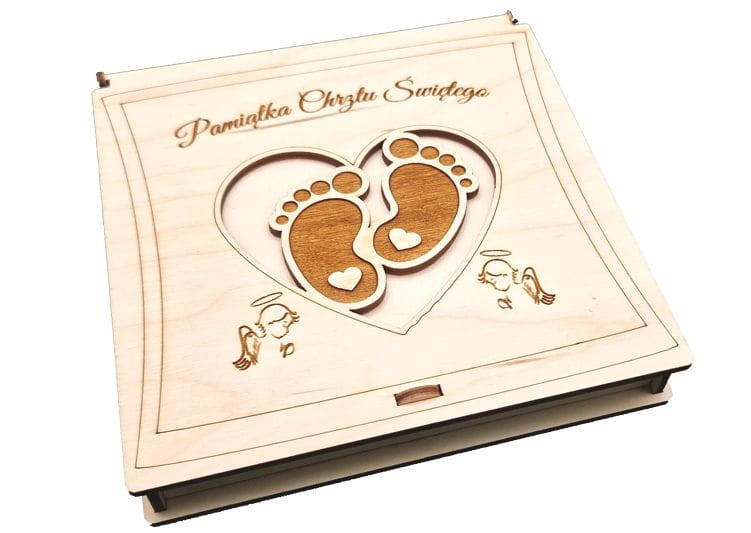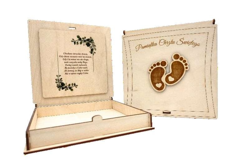 Stylowe i nowoczesne, otwierane opakowanie na drobiazgi z okazji Chrztu Świętego. Na wieczku motyw 3D małych stópek oraz napis Pamiątka Chrztu Świętego. W środku życzenia na Chrzest Święty. Istniej możliwość graweru i personalizacji; w tym celu podaj imię lub imiona dziecka w polu "Treść graweru" - usługa dodatkowo płatna.