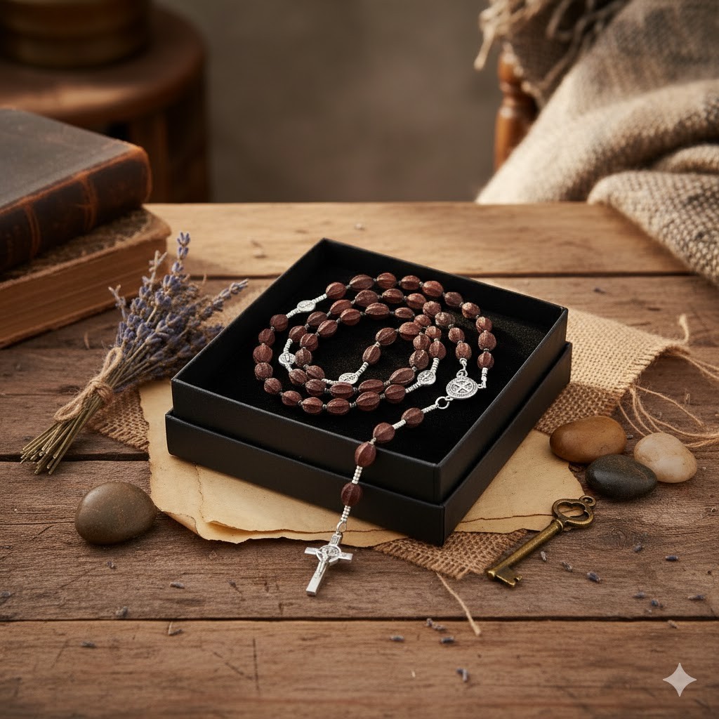 Ten niezwykły różaniec wykonany z naturalnych egzotycznych ziaren pochodzenia indyjskiego to propozycja dla osób ceniących modlitwę połączoną z symboliką głębokiej duchowości. Naturalny materiał paciorków sprawia, że każdy różaniec jest niepowtarzalny, a jego struktura i kolor wyróżniają go spośród klasycznych modeli.