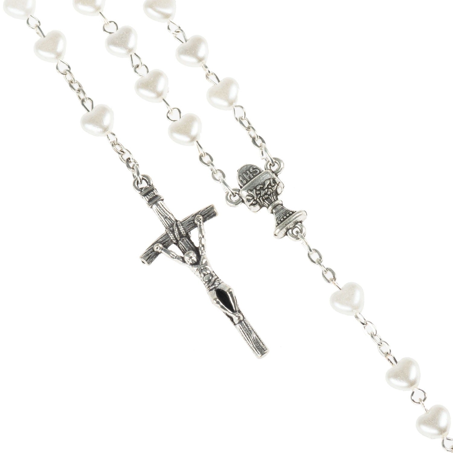 Różaniec białe serduszka - IHS - Pierwsza Komunia Święta - 6 mm - plastik