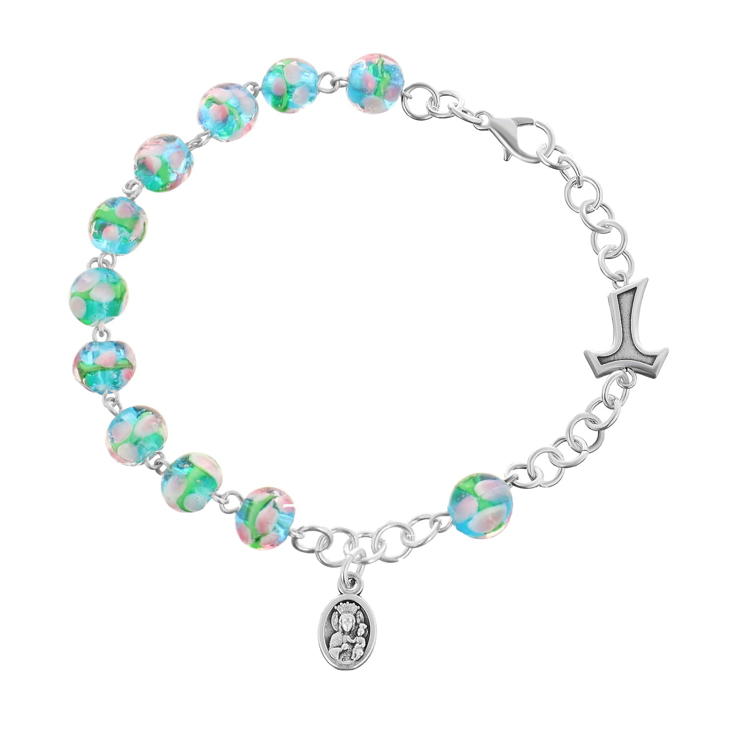 Różaniec bransoletka z krzyżem tau oraz medalikiem / szkło weneckie/