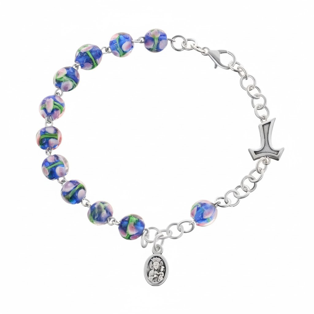 Różaniec bransoletka z krzyżem tau oraz medalikiem / szkło weneckie/