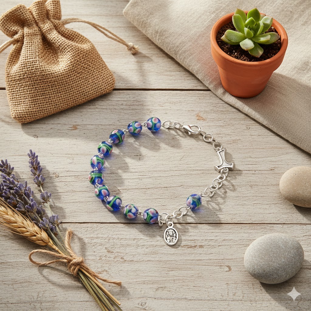 Ta wyjątkowa bransoletka różańcowa łączy w sobie piękno ręcznego rzemiosła oraz głęboką symbolikę chrześcijańską. To różańcowa forma noszona na nadgarstku — zawsze blisko serca, gotowa do modlitwy w każdej chwili dnia.