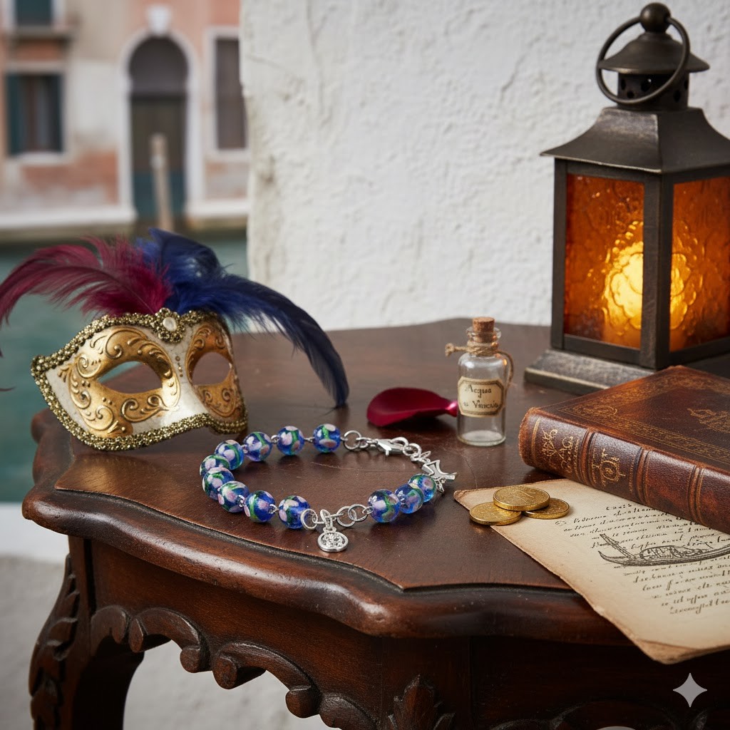 Szkło weneckie jest wytwarzane tradycyjnie od XIII wieku na wyspie Murano koło Wenecji. Każdy paciorek powstaje poprzez ręczne formowanie warstw stopionego szkła, co nadaje mu głębię koloru, połysk i delikatne refleksy świetlne.