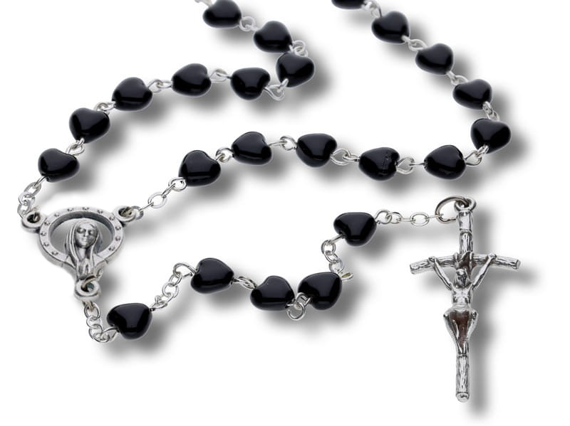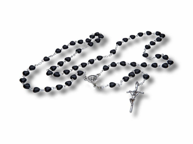 Różaniec w kolorze czarnym (paciorki w kształcie serduszek). Paciorki wykonane z tworzywa, łączenie metalowe w kolorze srebrnym, na łączeniu wizerunek Matki Boskiej.