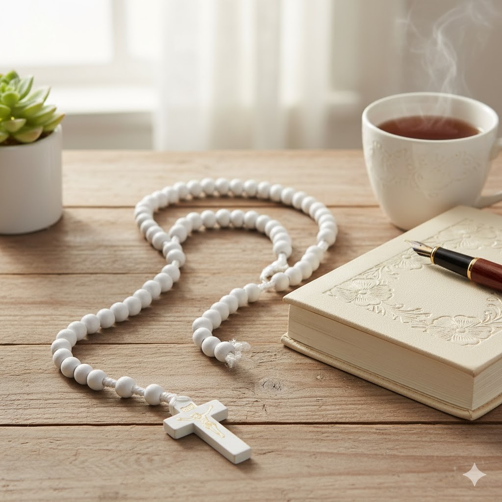 Biały kolor różańca symbolizuje czystość, światło i pokój – dlatego ten model szczególnie polecany jest jako różaniec komunijny lub dla osób rozpoczynających duchową drogę modlitwy. Drewno natomiast symbolizuje prostotę i pokorę – wartości, które towarzyszą modlitwie różańcowej od wieków.