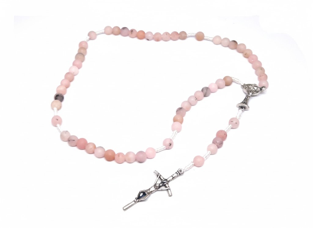Różaniec komunijny IHS z opalu różowego – kamienie naturalne, makrama