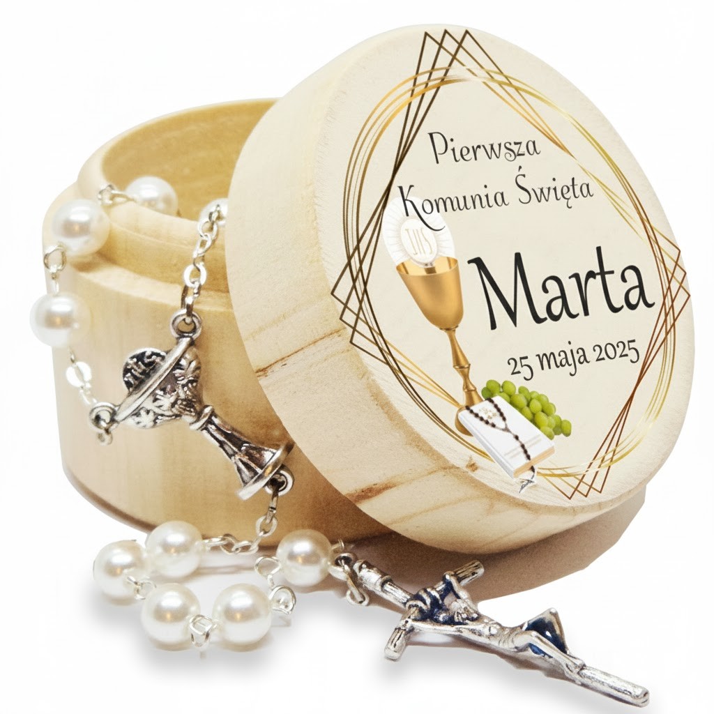 Różaniec komunijny w drewnianym pudełku z imieniem IHS – prezent na I Komunię
