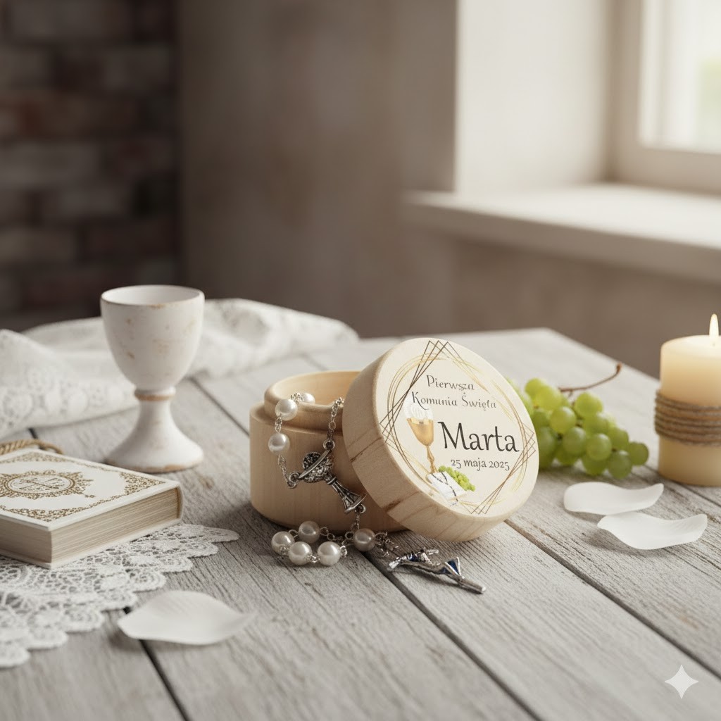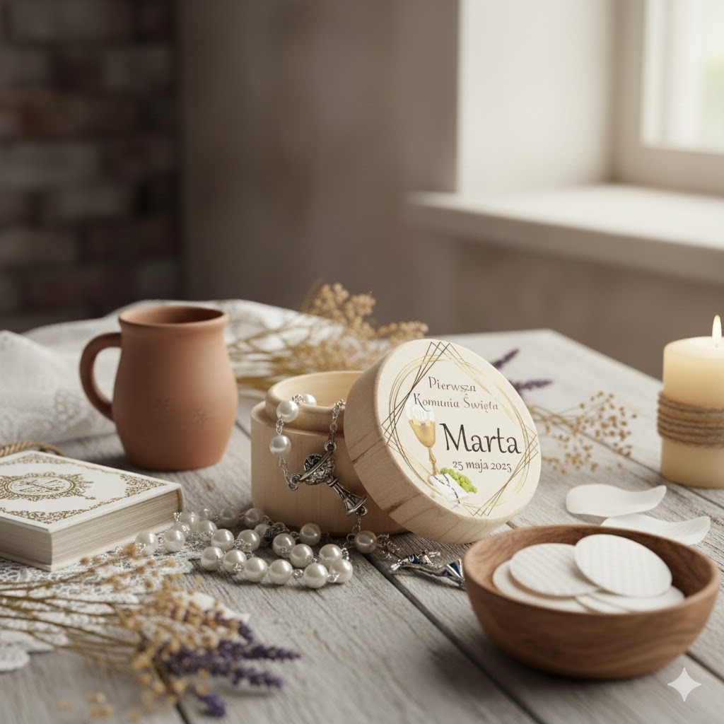 Na wieku pudełeczka drukujemy imię dziecka oraz datę uroczystości, dzięki czemu prezent nabiera osobistego charakteru. To przedmiot, który nie trafi na dno szuflady — będzie przypominał o duchowym początku nowej drogi wiary.