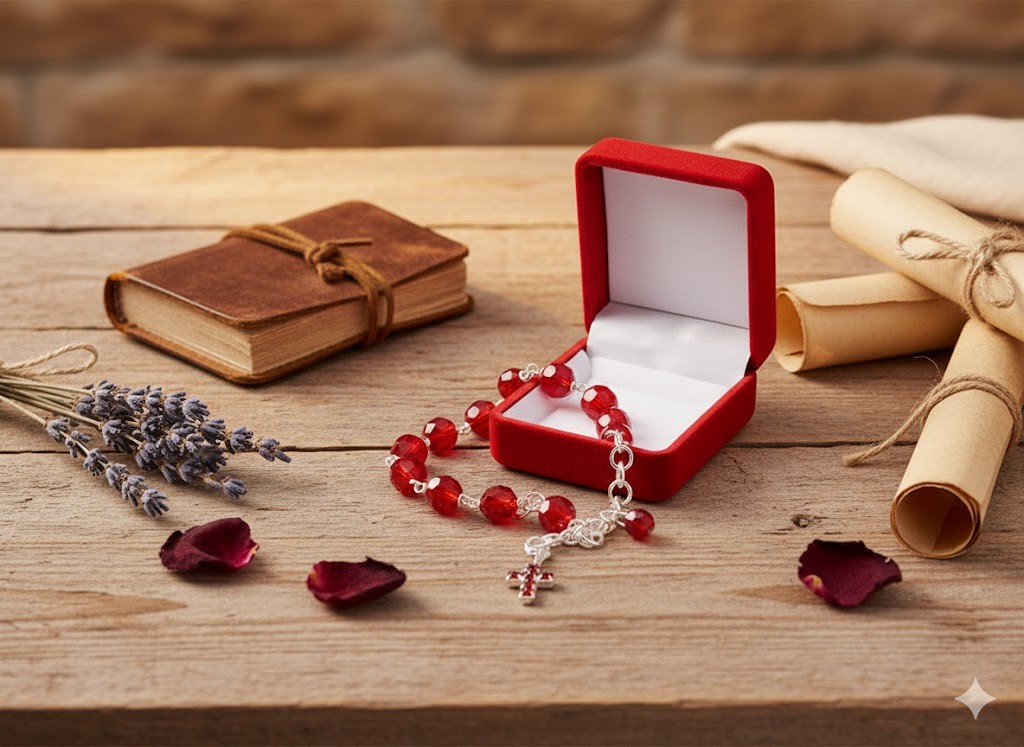 Różaniec łączy funkcję modlitewną (dziesiątka różańca) z formą eleganckiej biżuterii — idealny dla osób ceniących zarówno wiarę, jak i styl.