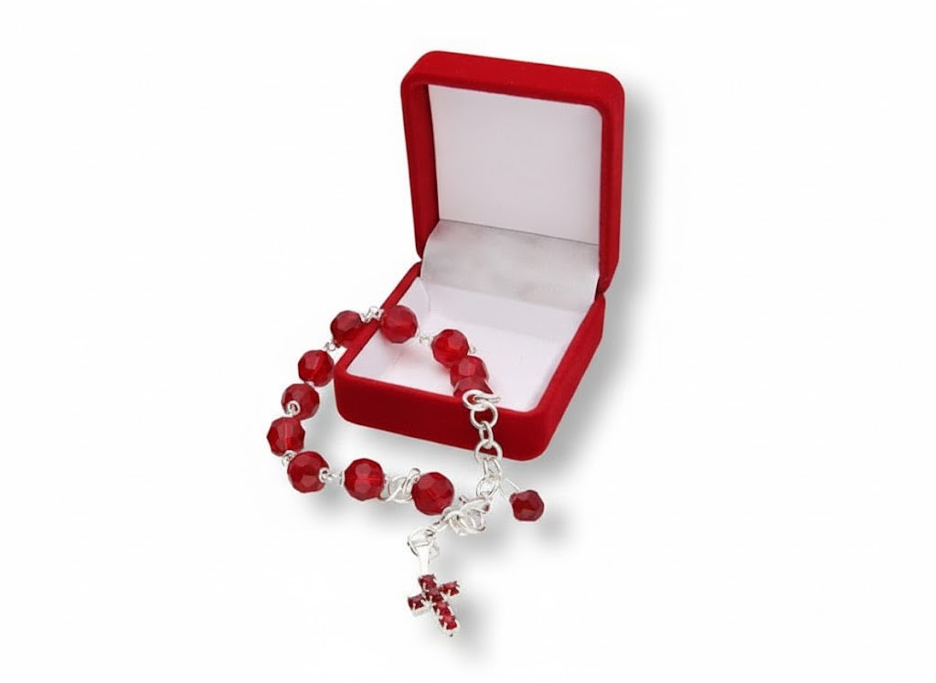 Przedstawiamy wyjątkowy różaniec „10-tka na rękę”, wykonany z wysokiej jakości szlifowanych kryształków w kolorze czerwonym. Każdy koralik ma średnicę około 8 mm, a krzyżyk został starannie osadzony z cyrkoniami Preciosa. Różaniec zaprojektowano z myślą o wygodzie – po rozpięciu ma długość ok. 23 cm, co czyni go idealnym na rękę lub jako modlitewny dodatek. Całość zapakowana w eleganckie, czerwone welurowe pudełeczko – gotowa do wręczenia lub przechowania jako pamiątka wiary. Produkt polski, wykonany z dbałością o każdy detal — gwarancja jakości i estetyki.