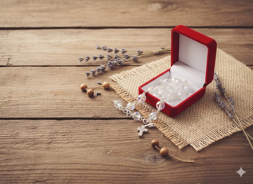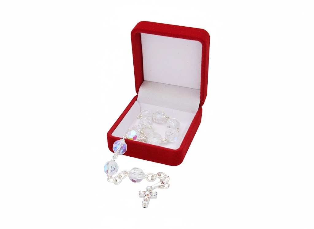 Bezbarwne kryształki sprawiają, że różaniec jest uniwersalny i pasuje do każdej stylizacji – subtelny, a zarazem znaczący.