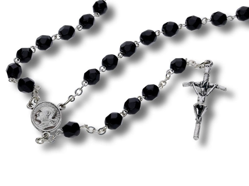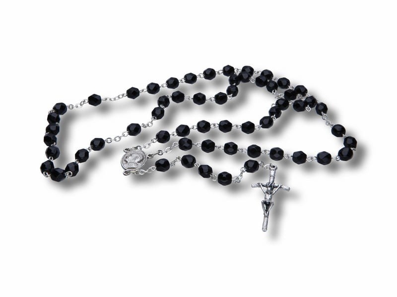 Różaniec w kolorze czarnym (kryształki). Kryształki wykonane z szkła czeskiego, łączenie metalowe. Krzyż Papieski