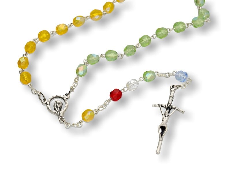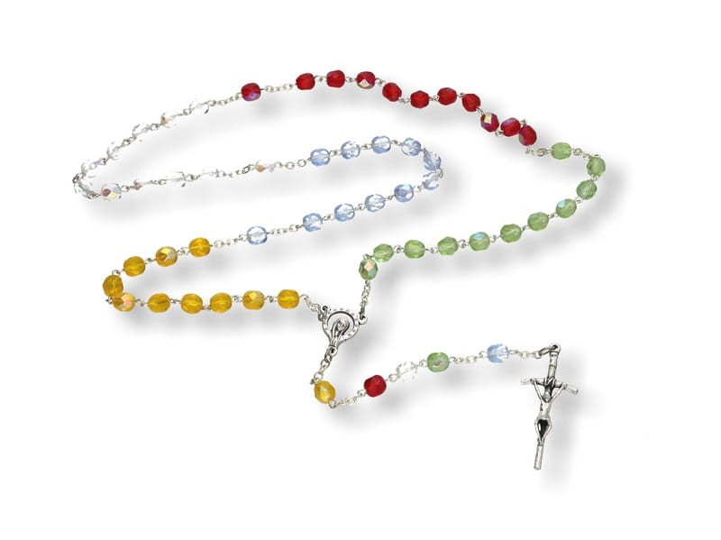Różaniec misyjny (kryształki). Kryształki wykonane z szkła czeskiego, łączenie metalowe. Krzyż Papieski