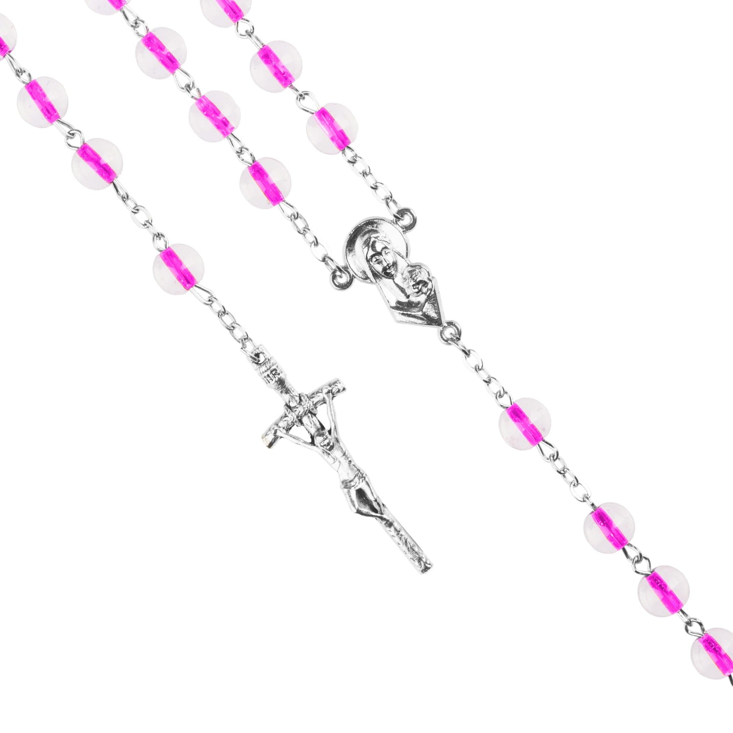 Różaniec szkło - w kolorze różowym (kulka). Łączenie metalowe - Matka Boska. Krzyżyk Papieski