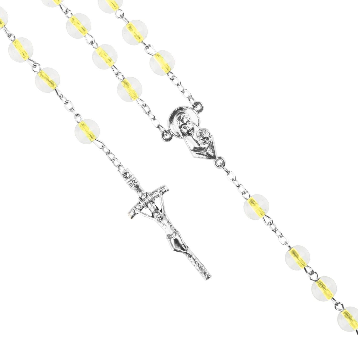 Różaniec szkło - w kolorze żółtym (kulka). Łączenie metalowe - Matka Boska. Krzyżyk Papieski