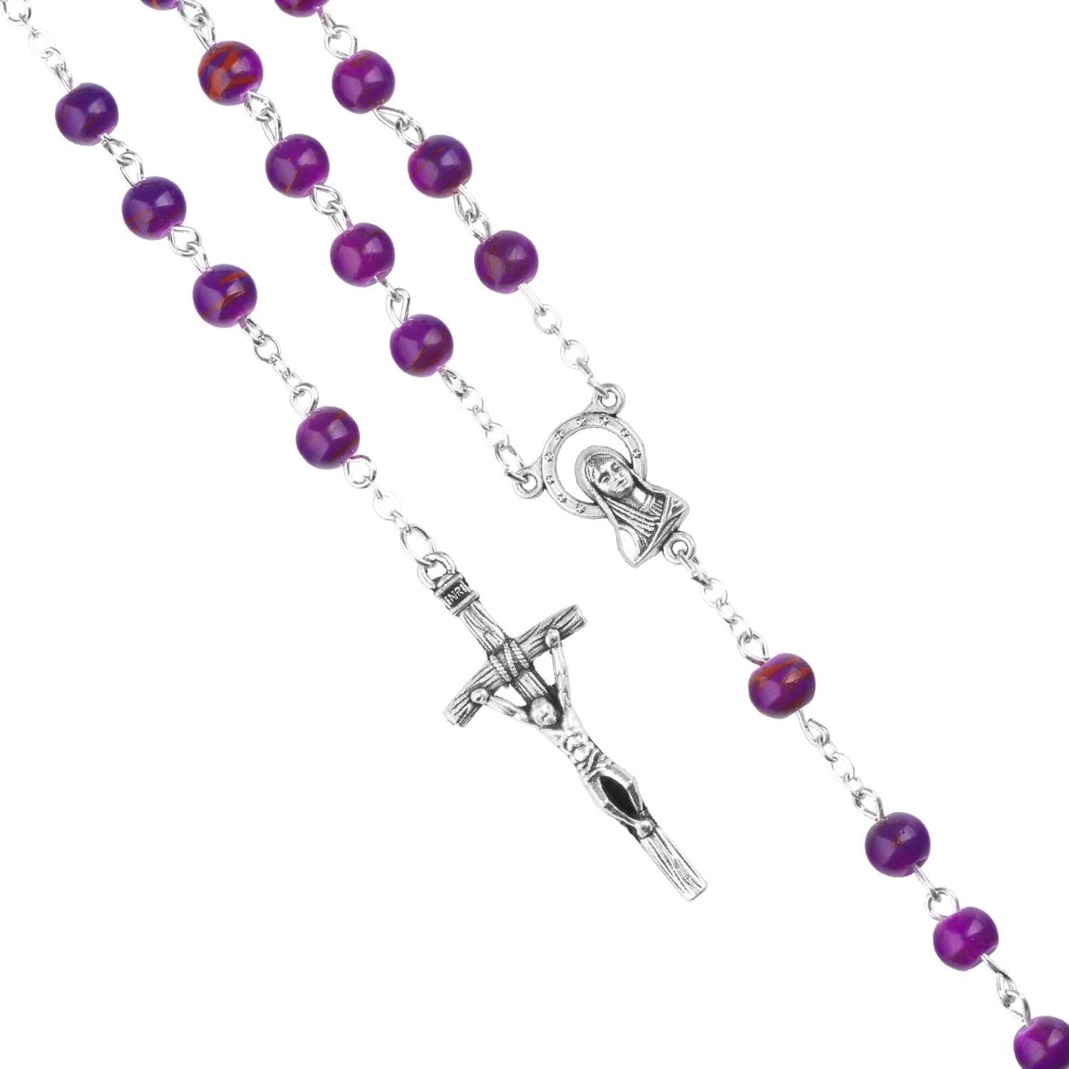Różaniec szkło - kulka FIOLET. Łączenie metalowe - Matka Boska. Krzyżyk Papieski