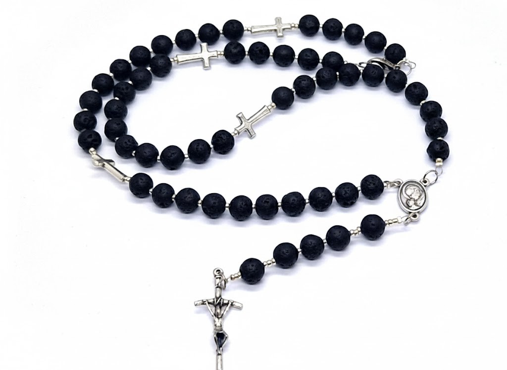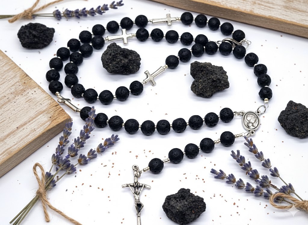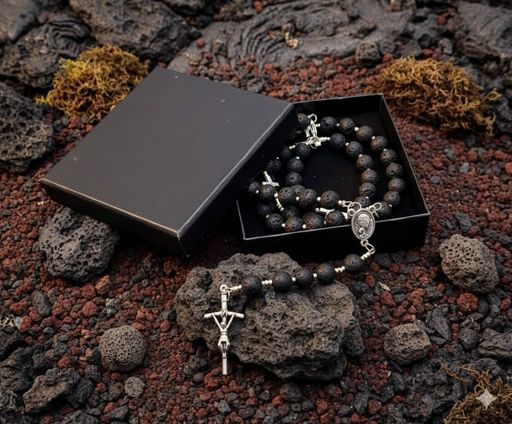 Lawa wulkaniczna jest minerałem, który powstaje w samym sercu ziemi — w ogniu, wybuchu i przemianie. Tradycyjnie kojarzy się z siłą, stabilnością i odnową, a w różańcu symbolizuje przechodzenie przez wewnętrzne trudności ku nowemu życiu i pokojowi serca.