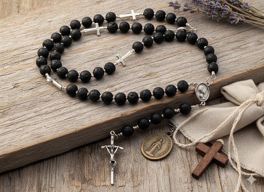 Ten papieski różaniec z minerału lawy wulkanicznej to wyjątkowe połączenie naturalnego piękna kamieni, duchowej symboliki oraz eleganckiego wykonania. Czarne, porowate paciorki wyróżniają się surową estetyką, a jednocześnie są przyjemne w dotyku i dobrze leżą w dłoni, dzięki czemu modlitwa staje się głębszym, bardziej świadomym doświadczeniem.