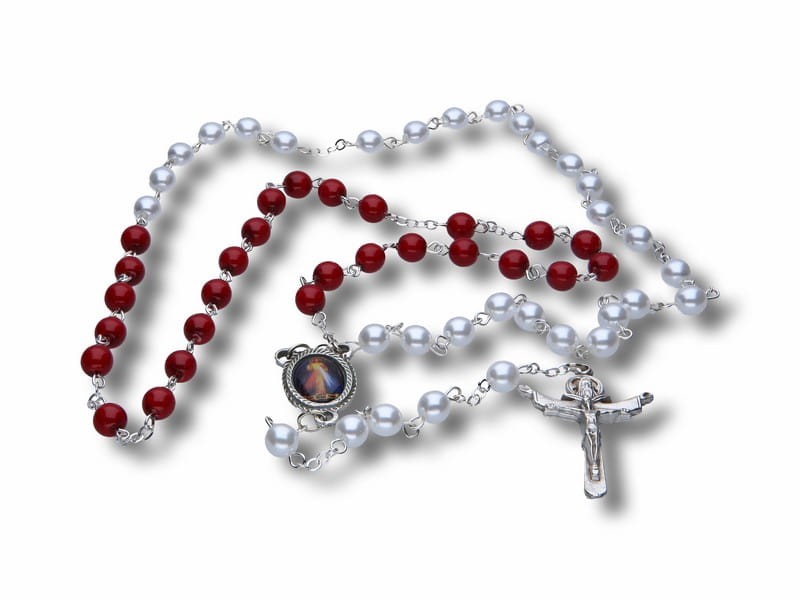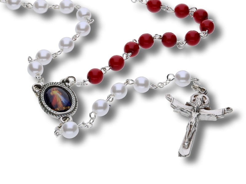 Różaniec perełkowy (biało-czerwony) Miłosierdzia Bożego, na łączniku wizerunek Jezusa Miłosiernego oraz Świętej Faustyny. Łączenia metalowe. Paciorki wykonane z szkła czeskiego.