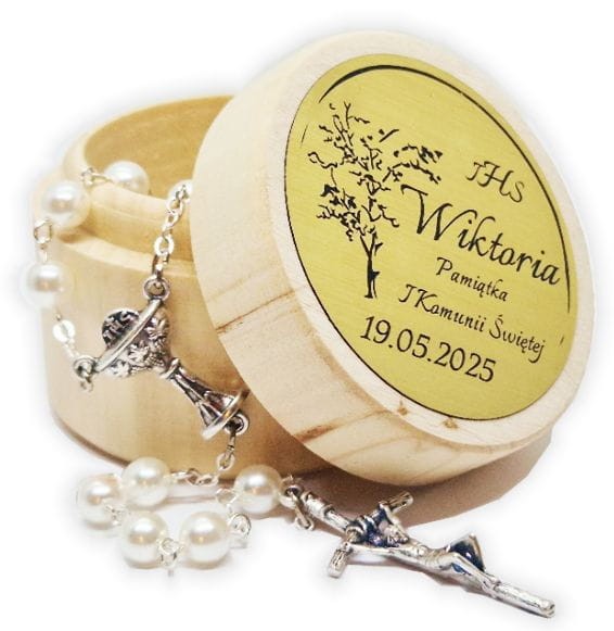 Różaniec komunijny w drewnianym pudełeczku grawerem