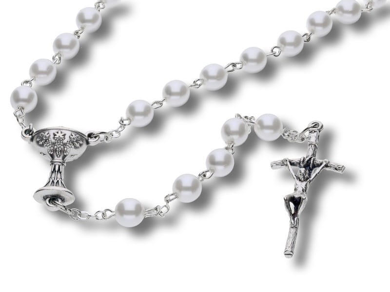 Piękne drewniane pudełeczko z grawerowanym imieniem i datą komunii IHS - a to wszystko wraz z komunijnym różańcem. Paciorki 6mm w kolorze białej perły lub hematyty do wyboru, wykonane z szkła czeskiego. Łączenia metalowe. Na łączniku kielich IHS. Krzyż Papieski