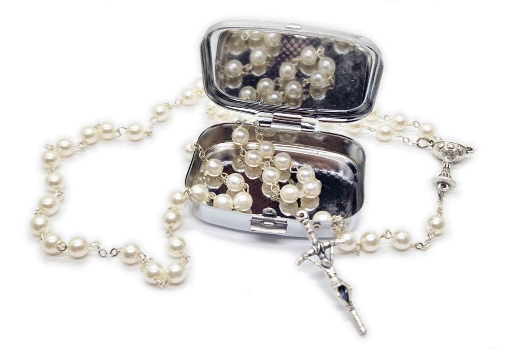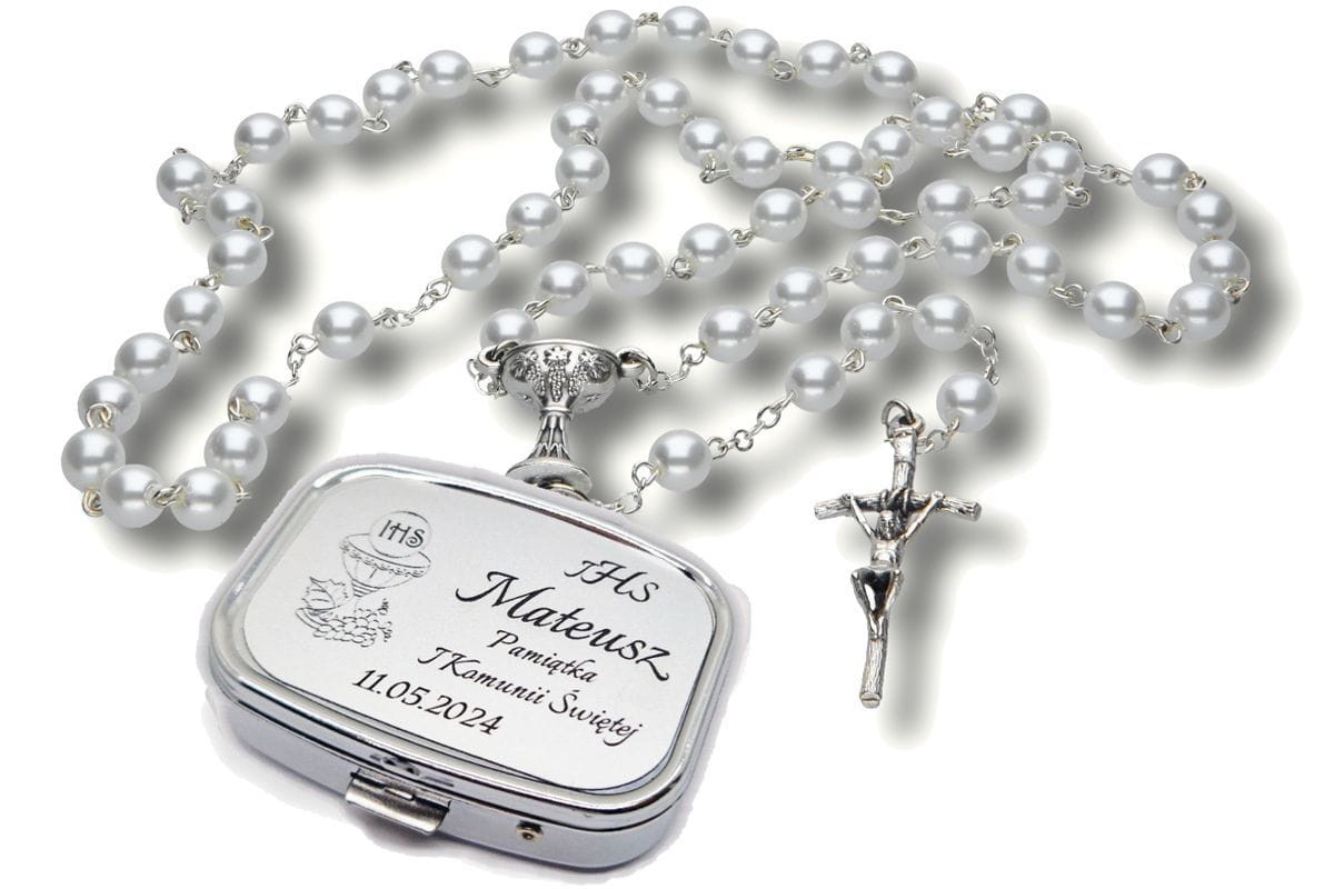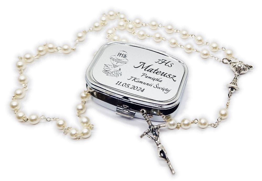 Piękne pudełeczko (w kolorze srebrnym-metalowym) z grawerowanym imieniem i datą komunii IHS - a to wszystko wraz z komunijnym różańcem. Paciorki 6mm w kolorze białej perły lub hematyty do wyboru, wykonane z szkła czeskiego. Łączenia metalowe. Na łączniku kielich IHS. Krzyż Papieski
