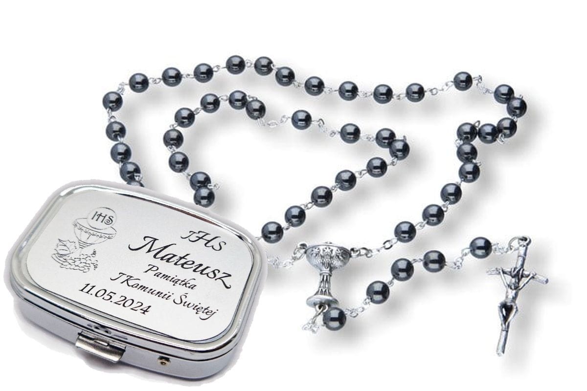 Różaniec w pudełku z imieniem IHS Komunia GRAWER