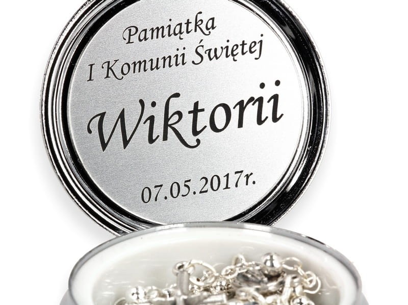 W środku pudełeczka grawerujemy imię dziecka + datę uroczystości