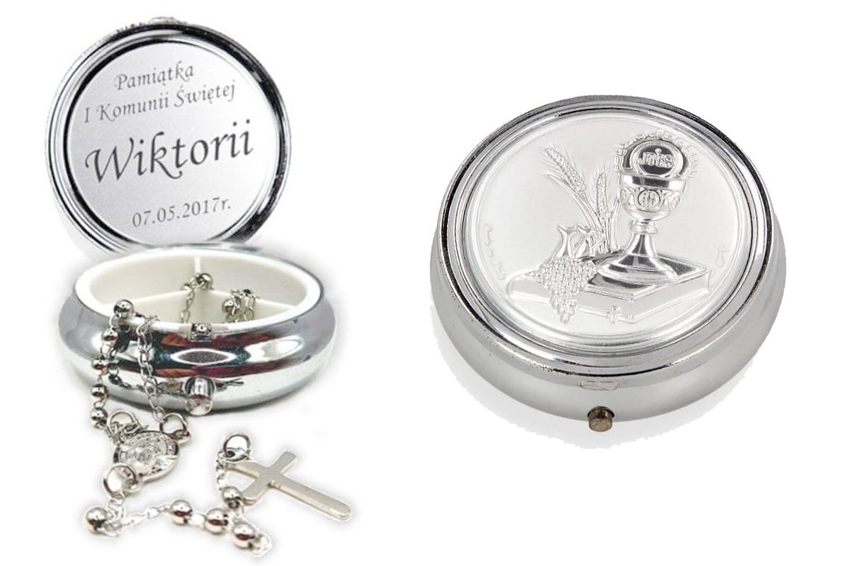 Różaniec w pudełku ze SREBRNĄ hostią IHS z grawerem