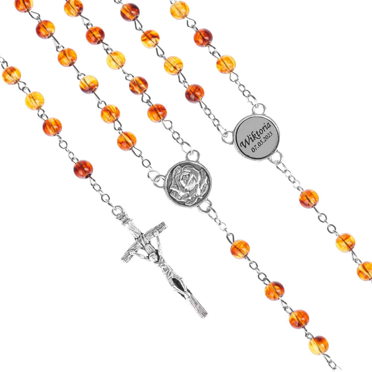 Różaniec z bursztynem syntetycznym 8mm + GRAWEREM