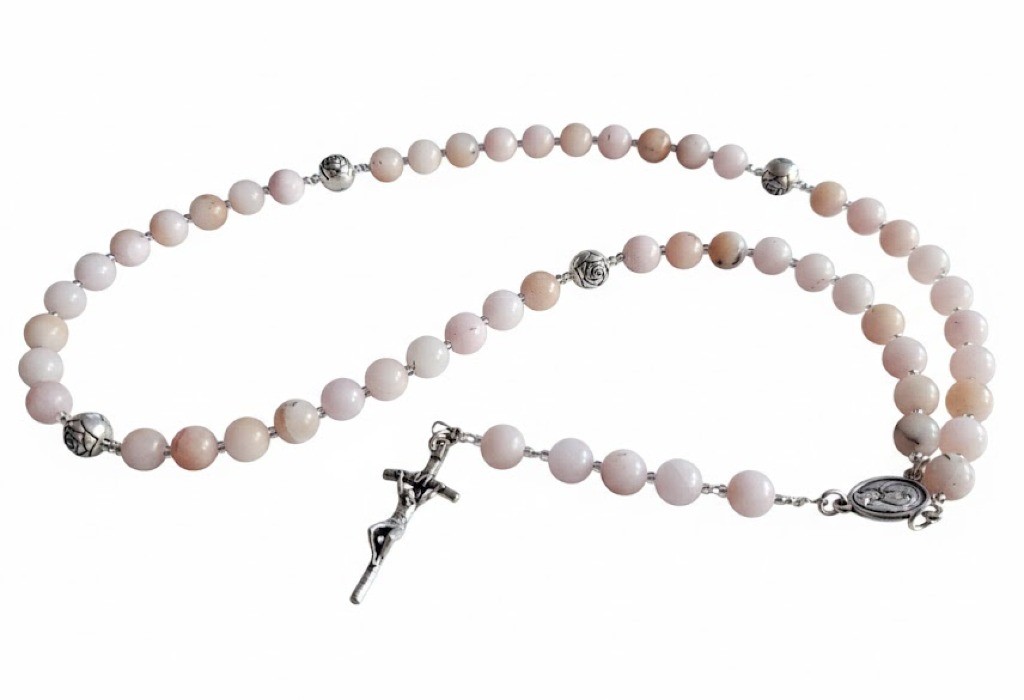 Różaniec z kamieni naturalnych – Opal Różowy, róża papieska 8 mm