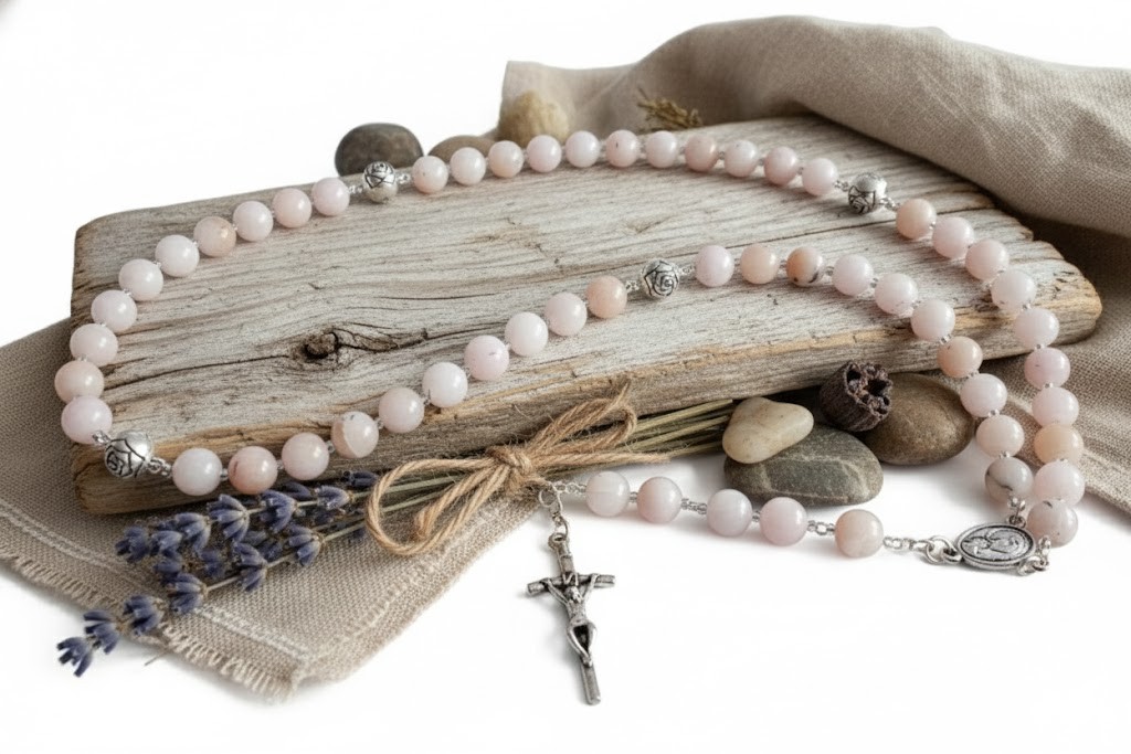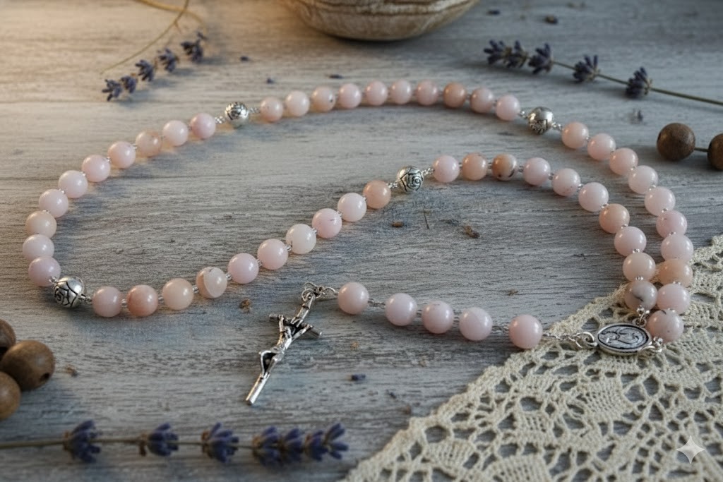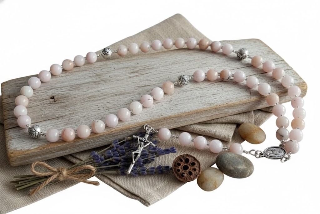 Ten różaniec z naturalnego Opalu Różowego zachwyca subtelną kolorystyką i delikatnością, łącząc piękno natury z duchową symboliką. Paciorki utrzymane są w pastelowych tonach różu, beżu i mlecznej bieli — każdy koralik jest niepowtarzalny, ponieważ opal różowy zawsze prezentuje unikatowe, naturalne przejścia barw.