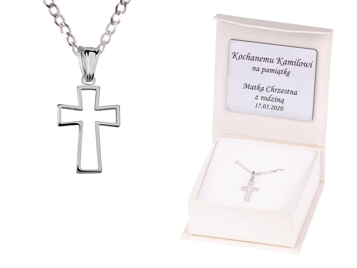 Medalik krzyżyk srebrny na łańcuszku (pr.925) w pudełeczku z grawerem