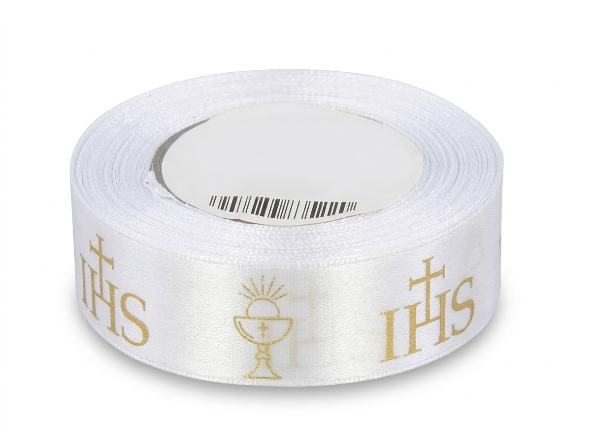 Satynowa wstążka komunijna z nadrukiem IHS (12mm x 23m)