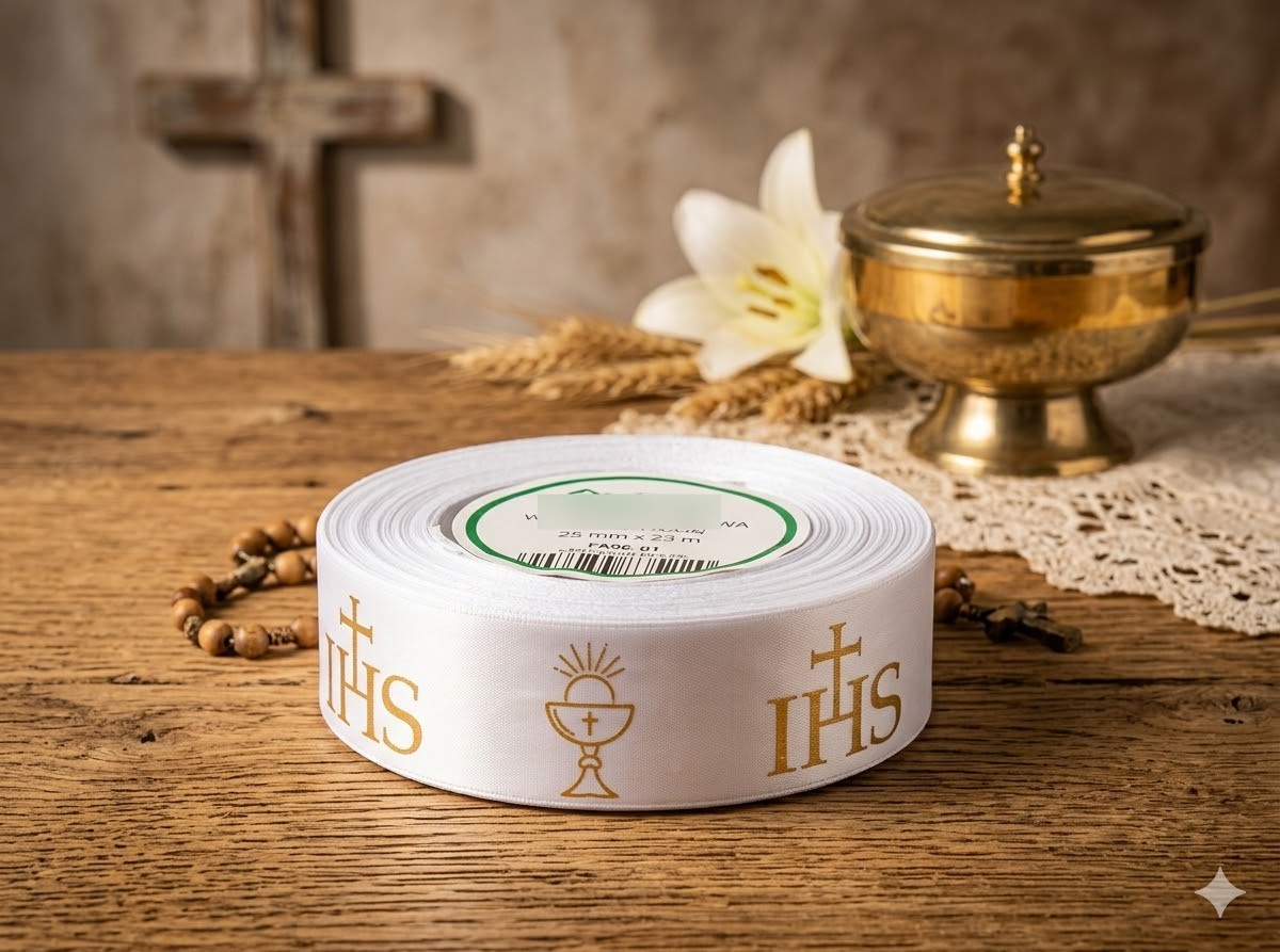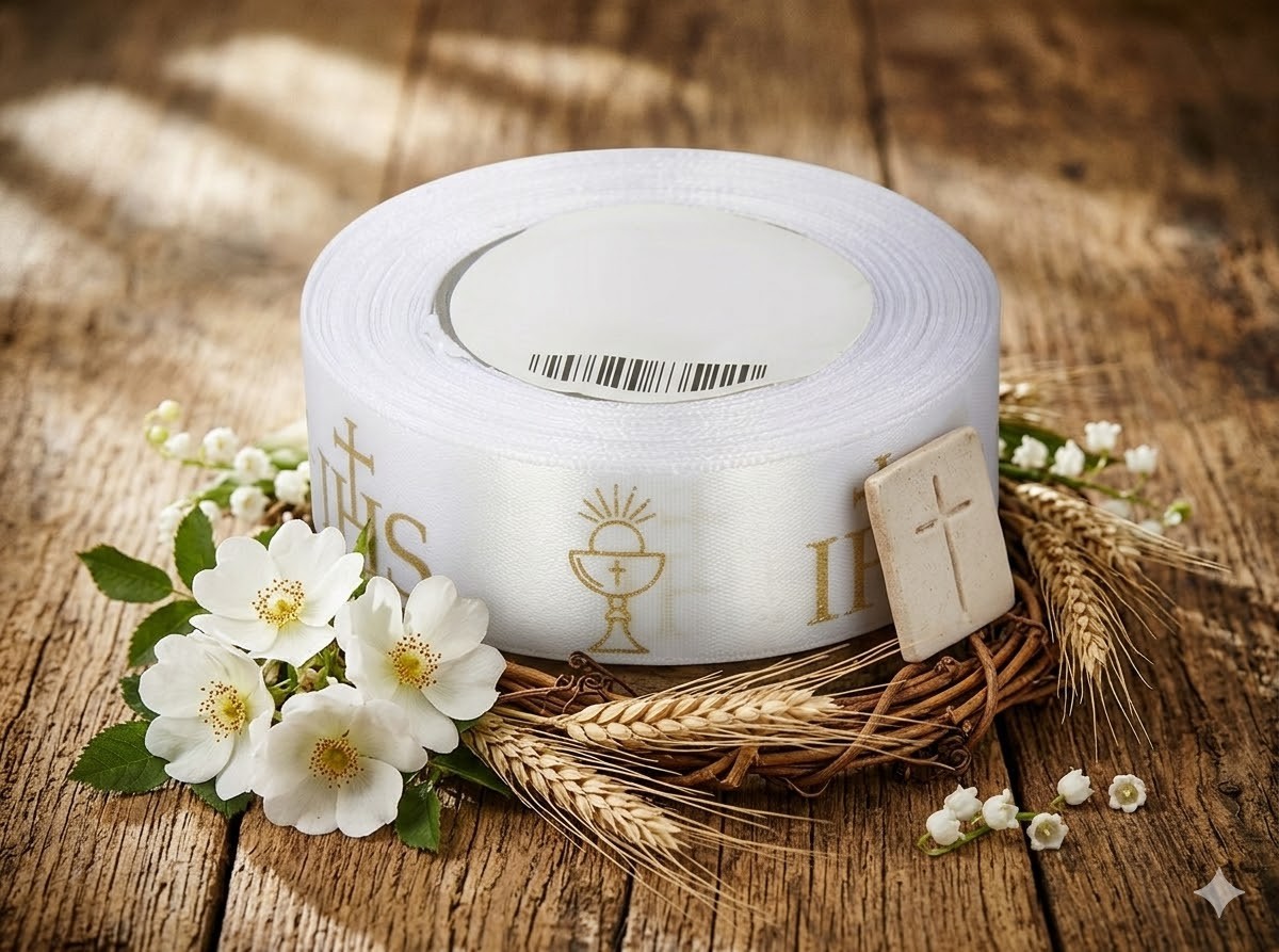 Wstążka satynowa z nadrukiem komunijnym IHS to klasyczny element dekoracyjny wykorzystywany podczas uroczystości Pierwszej Komunii Świętej. Subtelna biała satyna oraz złoty nadruk z motywem eucharystycznym nadają dekoracjom elegancki i uroczysty charakter.