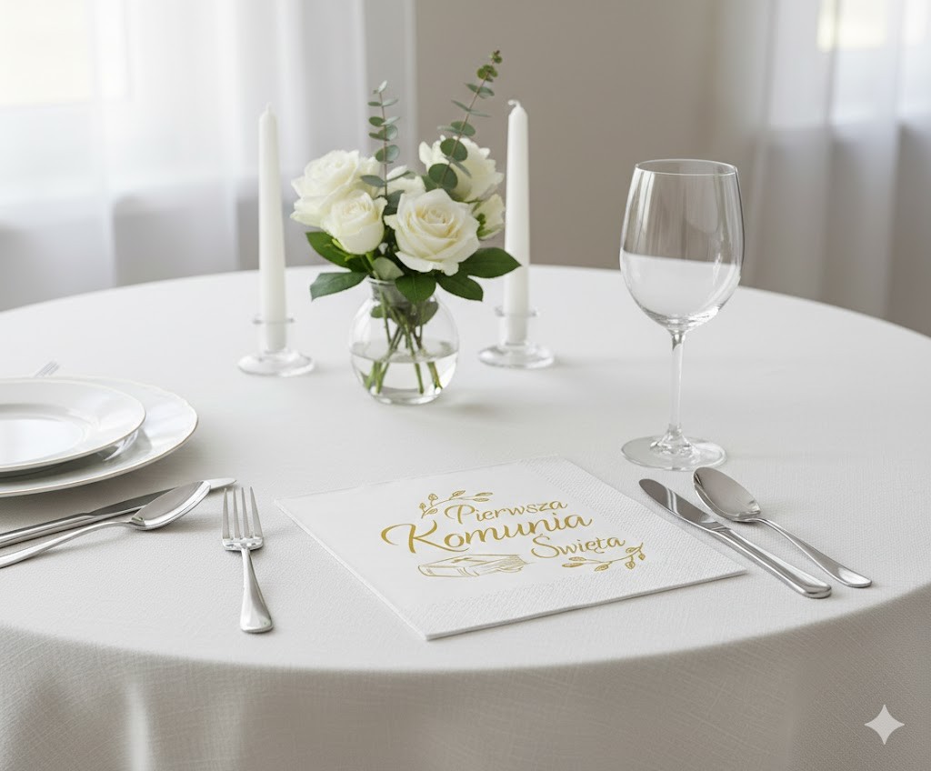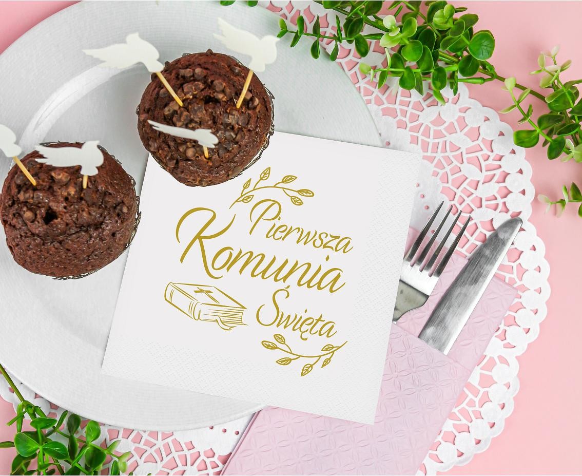 Na serwetkach znajduje się delikatny motyw graficzny przedstawiający Biblię, ozdobny napis „Pierwsza Komunia Święta” oraz subtelne ornamenty roślinne. Jasna kolorystyka i złoty nadruk podkreślają uroczysty charakter wydarzenia, nie dominując nad pozostałymi elementami dekoracji.
